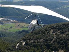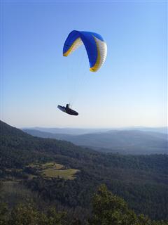 Geoff writes: today was the Aplec at Santa Brigida. This is a big party for the local town of Amer. Everyone goes up Santa Brigida, and eats a lot, drinks a lot, and dances. And all the paraglider pilots from miles around do the same, and fly too. This is a small ridge that can get crowded with less then ten gliders, on scratchy days. With 50 or 60, it is extremely crowded. So our plan was to go to fly somewhere else, then go there later on for the party, and, maybe, flying, if it was less crowded.