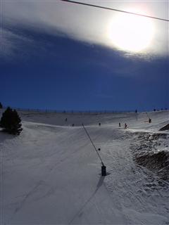 With the snowboarding world championships on at La Molina, it took a while to get up to Masella. Once there, conditions were really good. The termperatures were cold, but acceptable, and although the wind was increasing throughout the day, it was never so windy that they closed any lifts. There was a dusting of new snow and they have made a lot more artificial snow, so there were more good runs, and the cold meant nothing got slushy. We skied for five hours and even saw a sail plane being towed up from Cerdanya. First one we’ve seen this season.