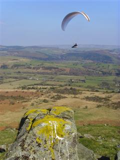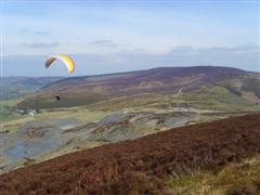 Geoff writes: another sunny, but windy, day. After some discussion with Martin and Mick, we wrote off Corndon, because of the wind, and decided to go to Moel y Faen, at the Horseshoe Pass, near Llangollen. We’d never been before, but Mick and Glyn, who also came out, know it well. It seems a nice site, with an old slate quarry in front to provide thermals, but the problem was that the wind wasn’t quite the right direction, and it was also a little strong. The result was pretty rough flights for most of us – including a very big collapse for me when I went a little too close and too low to the quarry – and not a brilliant day – though Glyn did fly for quite a while, as usual. But he’s an ex-skydiver!