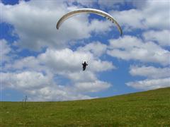 The sky just got better and better, but repeated attempts to get up were unsuccessful, until Phil W. managed to get up and away. Martin tried several times, but at one point got flushed and went down. I had a punt, but had hooked my speedbar round my chest strap. I unclipped one of my leg loops to undo it, but didn’t have the height to clip it back in. My leg loops form my chest strap, so undoing one means I basically flying way outside the recommended chest strap setting. I had two choices – bottom land or try to scratch back up and top land. I know the dangers of having too wide a chest strap and I also know how rough Clatter can be and that it was really stupid not to do my pre-flight check more thoroughly. Landing just below the plantation is very tricky and you need to be able to be in full control of your glider to position yourself properly to get over the trees and along the slope. I decided that the better option would be to scratch back up and top land where I would have no obstacles and could bring the glider in more easily.