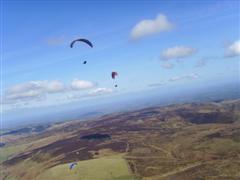 Geoff writes: a pretty good day on the Long Mynd. We had been quite optimistic about doing our first XCs of the year, and so it turned out. The Long Mynd was very busy with lots of visiting pilots from as far away as Scotland, and, of course, including the usual lot from Derbyshire and the Pennines. We launched around 11.15, and it was easy to stay up, and stay reasonably high, though it wasn’t about 12.30 until we decided it was worth going. It was very slow going, and quite weak at first, and as always it helped being in a gaggle. Judith and I were with Barney, Andy, Phil, the Gants, Martin, and various others. At one point I held back and lost them all – I wasn’t really thermalling that well, getting used to the new glider (that’s my excuse), but eventually a few thermals later, I managed to catch up the gaggle again, which is something I certainly would not have been able to do on the Hook. As the day progressed, the thermals got stronger, and more organised, with cloud base rising to about 5300′ (1600 metres), though progress was very slow overall.