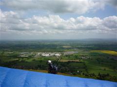We got ready and waited for a good time to launch. Geoff got off first, but launched into the tail end of the thermal and had to slope land, but I spotted three pilots thermalling up from the town and headed over to them. The thermal took me to base at 3600′. I went on glide to the next cloud, but hit some lift on the way. As I turned round to circle I found my turn blocked by Jocky and two army blokes. We did all fan out and searched for lift, but we got low, scrabbled around in a weak thermal and then spotted two guys behind us screaming up. I dashed back upwind to them. Geoff joined the same thermal and we all climbed up together back to base.