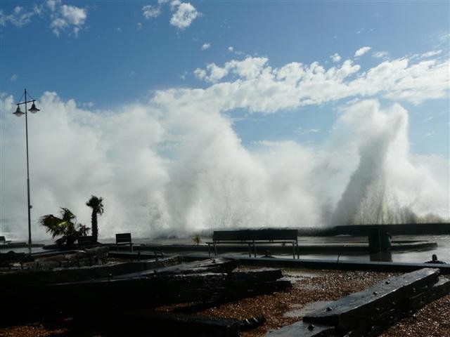 Massive waves crashing into the pier.
