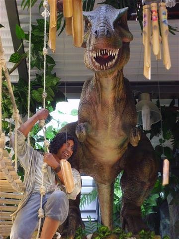 Moving display under the ceiling of a bead shop. The dinosaur growled too!